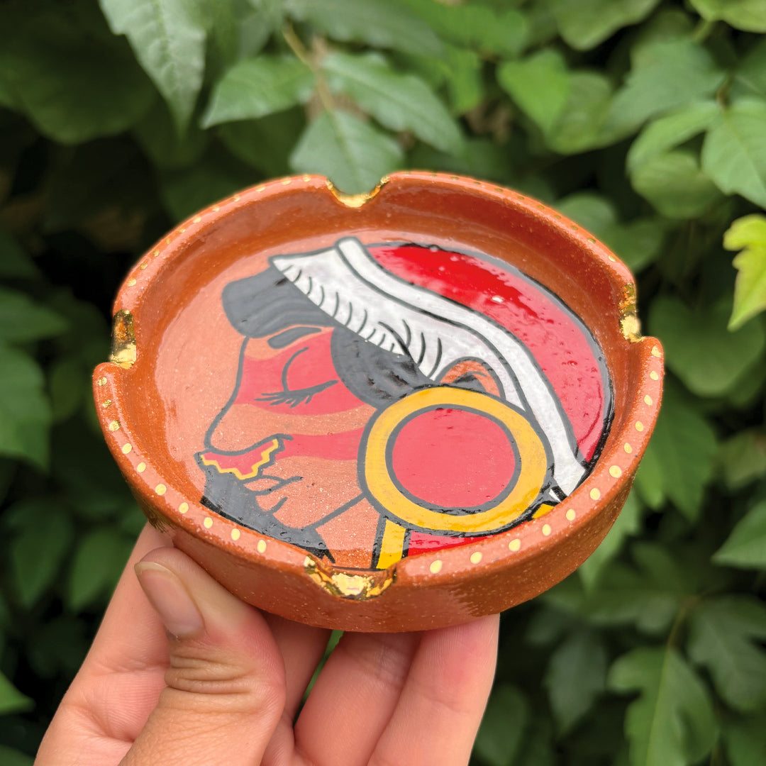 These beautifully handcrafted ceramic ash trays, are sure to elevate your smoking experience. Each tray is a unique work of art, hand-painted with intricate depictions of majestic Aztec gods, such as Chantico, in vivid colors and striking detail. The durable ceramic construction provides a stable surface for your cigarettes, while the deep reservoir safely contains ashes. The bold Aztec motifs and earthy ceramic tones add an eye-catching decorative accent to enliven any room or outdoor space.