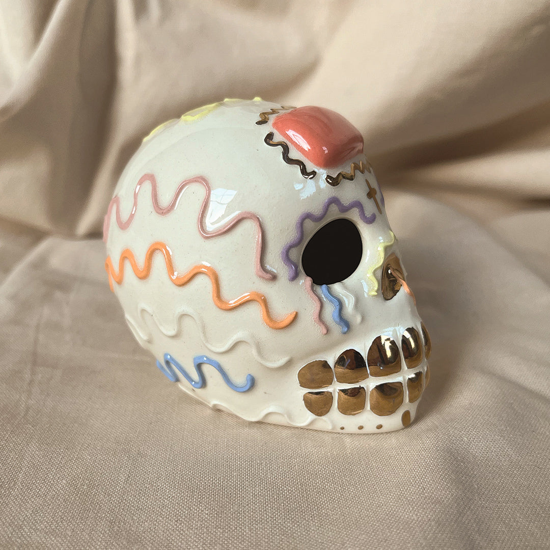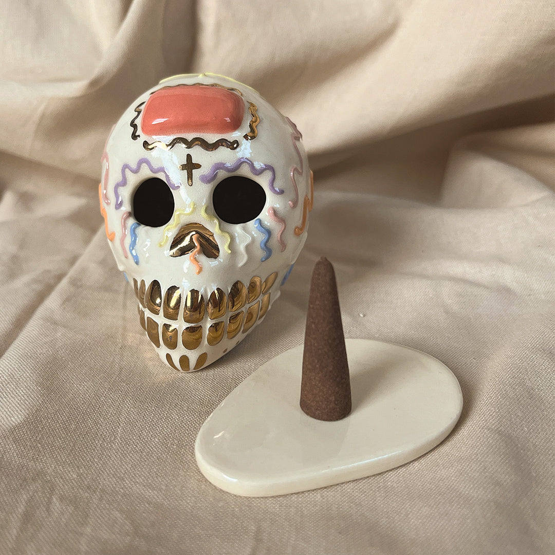 This ceramic calaverita de azucar, or "sugar skull," serves as both a decorative piece and a functional incense holder. This captivating blend of form and function makes the calaverita de azucar a stunning centerpiece that can elevate any space, whether displayed on a mantle, shelf, or altar.